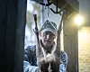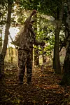 Tilbake på Ny Vraa. Det er ikke helt enkelt å snike seg lydløst inn i løvskogen og finne et passende tre når blader skjuler de tørre kvistene på bakken. Med rolige og kontrollerte bevegelser fester Yngve Mørland Sekkenes en liten plattform til trestammen. Han tester at den bærer vekta, før han klatrer opp. Så fester han ei slynge høyere på stammen og klatrer videre. Anordningen kalles saddle. Fordelen er åpenbar, jegeren kan flytte posisjonen sin fra gang til gang, framfor å kun bruke faste jakttårn. Til slutt sikrer han seg selv med en egen line, før han rolig heiser opp bue og pilkogger.