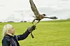 Ung vandrefalk trenes opp til jakt. Her skal den klatre i høyden for så å stupe etter en lokke. Trening av rovfugl er svært tidkrevende. Foto Leix