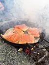 Jeg lar fisken tømme seg for krefter, og får etter hvert buksert den inn mot bredden. Nå gjelder det. Vi må jo ha mat! Mina kommer til med håven, fisken sneier borti nettmaskene både tre og fire ganger, før den endelig kan løftes trygt på land. En kubbe av ei røye! Vi hyler i kor, stemningen er euforisk. Nå venter et festmåltid!