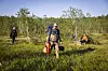 Mye utstyr skal bæres innover ødemarka når forskerteamet gjør feltarbeid. Fra venstre: Juho Vuolteenaho (NIBIO), Jon Hamner Magerøy (NINA) og Paul Eric Aspholm (NIBIO).
