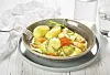 Server gjerne retten med reker og kokte mandelpoteter. Topp det hele med en skje saltet ørretrogn. Har du lyst på grønnsaker, kan du rett og slett bruke det du liker best.