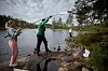 Litt lenger bort høres hyl og latter. Det kaves med stenger og mark. Sunniva (15) og Mathilde Selås (14) drar inn både ørret og abbor med støtte fra bestefar, Nils Olaf Selås (73).