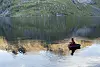 Fiske med wobbler og kulesøkke fra bellybåt i stort fjellvann. Under svømmeføttene på denne fiskeren svømmer fisker på langt over fem kilo, men de står dypt og spiser smårøye på dagtid. Før dagen var omme, hadde 15 kilosørreter vært i håven!