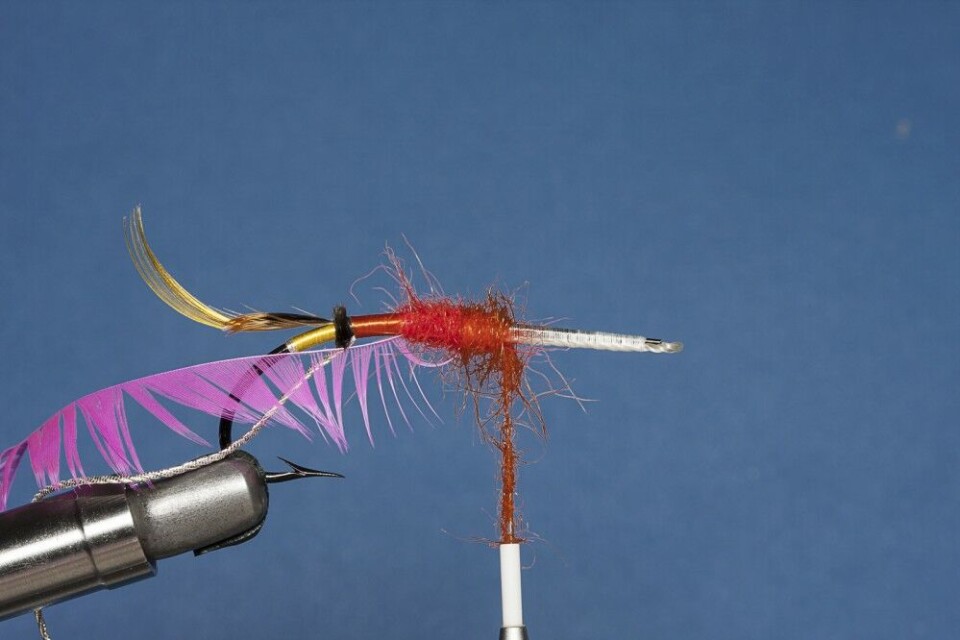 4. Fest inn et magenta farget hackle i spissen (fjær med tette fibre kan gjerne strippes på ene siden), dubb kroppen i henholdsvis like deler rød, orange, rød og blå selull.