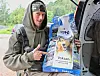 Simen Blix Aaserud (30) står utenfor bilen med en 15 kilos sekk tørrfôr og Jakt & Fiskes utsendte blir for en gangs skyld målløs.