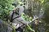 En femkilos karpe og nesten like mye undervannsvegetasjon er på vei inn i håven.