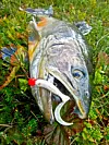 Også små klassiske gjeddewobblere i rødt og hvitt er verdt et forsøk. De store røyene er ikke finspiste når de serveres noe de virkelig vil ha. Wobblere på 10 – 17 cm går ned på høykant under rette forhold!