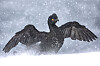 Toppskarv med utspilte vinger i tett snøstorm ved kysten.