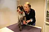 Oksett har fått anbrakt ei vorstehertispe på behandlingsbordet, og forklarer om muskelgrupper og ledd.