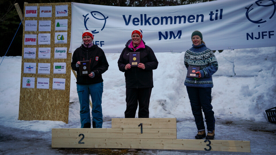 Nina Merete Tørmoen (i midten) er landets beste isfisker i dameklassen, mens Lisbeth Bjørnstad (til venstre) knepet sikret andreplassen foran Aina Brusveen (til høyre).