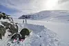 Året etter. Det er første helg i mai. Vi befinner oss drøye 1000 meter over havet og ser knapt hverandre. Mens fotballen sparkes i gang nede i bygda, driver to fiskeidioter og aker på baken nedover en stupbratt fjellvegg med pulker og tunge sekker.