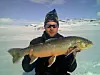 – Her er det fisk! Vesentlig større, fastslår Christer mens han kjører fisken nervøst i hullet nærmest land. Her går det en marbakke som røya har saumfart gjennom morgentimene. Fisken sitter godt på mormysjkakroken og er åpenbart ferskvare. Den er livlig, og Christer kan ikke annet enn å la fisken rase ifra seg.