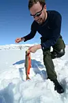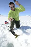 Christer Storrønning (26) er tilbake i hjemlige trakter. Hektiske dager med jobb og studier gjør at dette kun er sesongens tredje isfisketur. Mens vi skjærer småbiter med tørka reinkjøtt og super svartkaffe, går vi inn i en vel­ kjent sjelstilstand. To fiskeidioter girer opp hverandre, men noen ganger er det faktisk hold i fiskepraten: Nå skim­ter vi fiskens knallrøde buk gjennom det klare fjellvannet. Røya er i under­kant av kiloen, men vakker og i perfekt kondisjon. Er dette isfiskesesongen alt skal gå på skinner?