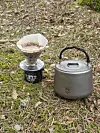 Klassisk titankjele med hank, lokk og helletut med metallfilter. Leveres i polstret mesh pose med stramming.