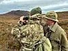 I Skottland jakter Macdonald i lokalt vevd tweed året rundt. Her peker han ut en hjort for en norsk jeger i moderne syntetklær med kamuflasje. Hva funker best?