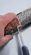 Grovhaket gjeddemark på ørret tatt i Femunden.