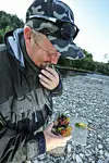 Selv har mannen aldri brydd seg om å fiske etter floa. I stedet vurderer han forholdene, som for tiden betyr å sette inn et ekstra støt før solnedgang. Vi tømmer ut kaffeskvettene.