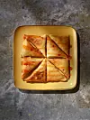 • Hvert rektangel skal nå brettes slik at du får en «lomme» til å legge fyllet i, og nok ekstra deigflate til å lukke denne lommen. «Limet» ditt er en blanding av mel og vann som du pensler på.