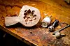 For å felle inn biter av gevir, tre eller metall, må man skjære ut et passende felt. Frode bruker spesielle kniver til formålet.